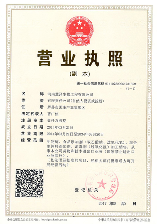 鄭州慧澤生化科技有限公司是一家充滿朝氣的科研生產(chǎn)型高技術(shù)企業(yè)。目前公司業(yè)務(wù)主要集中在精細化工、食品化工和微生物制劑行業(yè)。公司現(xiàn)已建成鄭州、焦作、新鄉(xiāng)三個生產(chǎn)基地,其中河南新鄉(xiāng)輝縣孟莊生產(chǎn)基地占地70畝,總投資達1.2億?,F(xiàn)擁有年產(chǎn)100000噸過氧化氫消毒劑,年產(chǎn)8000噸的過氧化鈣和年產(chǎn)5000噸的雙乙酸鈉的生產(chǎn)線,同時開設(shè)有生產(chǎn)總量5000噸的枯草芽孢桿菌、地衣芽孢桿菌等微生態(tài)制劑發(fā)酵生產(chǎn)車間。公司始終堅持“以人為本,科技興企,品質(zhì)優(yōu)良,用戶滿意”的經(jīng)營宗旨。為客戶創(chuàng)造價值更多的價值...
